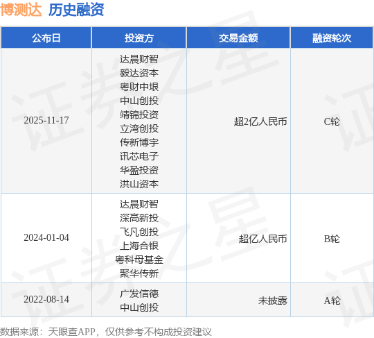 正规配资十大排名 【投融资动态】博测达C轮融资,融资额超2亿人民币,投资方为达晨财智、毅达资本等 正规配资十大排名 来源:元鼎证券配资平台 网站:元鼎证券_元鼎证券官网入口_配资网上炒股配资平台 查看:122 日期:2025-11-20 05:11:47