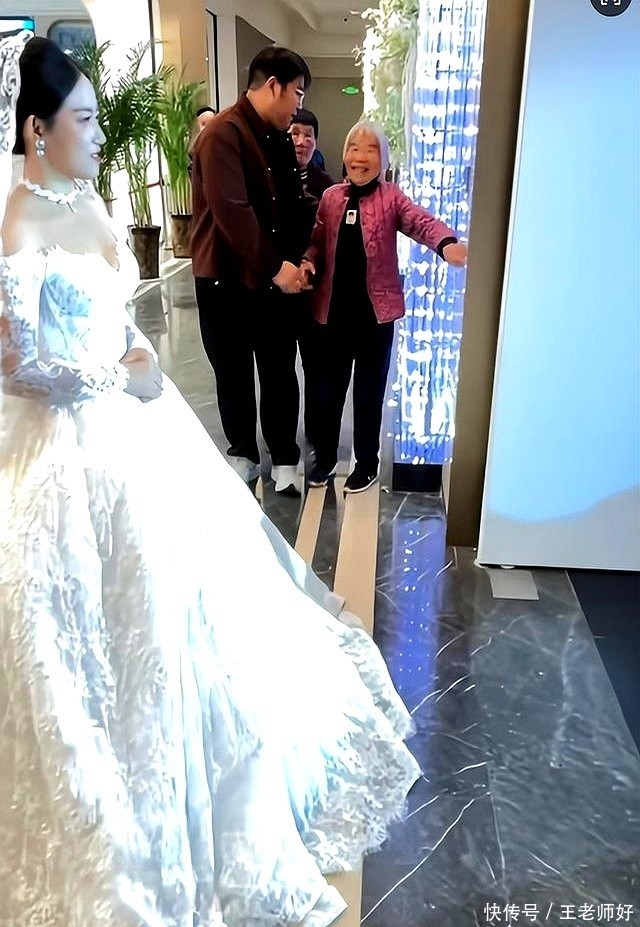 有人在现场录了好几个角度的视频。侧面那个画面最清楚,两扇大门刚推开一半,酒店门口的红门槛那里,老太太的两只脚已经跨出去一只半,只差半步就要和新娘面对面。胸前那张黑白照片也跟着晃,灯光照上去,照片里那个男的,头发梳得整整齐齐,穿白衬衫,看着像是三十来岁的人。